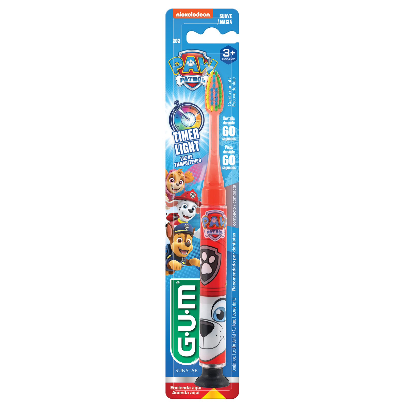 El cepillo con luz Paw Patrol de GUM® tiene luces LED que iluminan todo el cepillo y se encienden durante 60 segundos para animar a los niños a cepillarse los dientes durante más tiempo. El tiempo recomendado por los dentistas para el cepillado es de 1 minuto para cada maxilar.