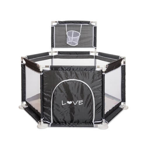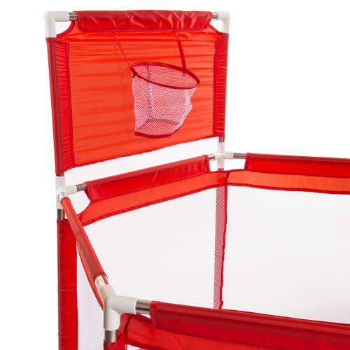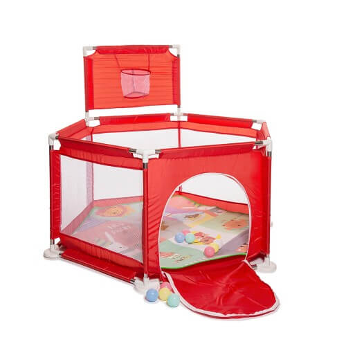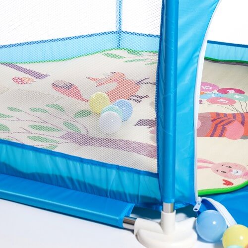 • Con pelotas, aro de básquet y una alfombra con diseños.