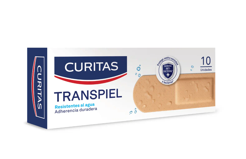 Los Apósitos adhesivos Curitas Transpiel son ideales para cubrir cualquier tipo de heridas pequeñas. Las vendas se estiran y adaptan a los movimientos de la piel, dejándola respirar correctamente. Además, posee una almohadilla antiadherente que protege la herida. Se distinguen por ser resistentes al agua y adherirse de forma duradera a la piel. Cabe destacar que las Curitas están disponibles en distintos tamaños para poder cubrir completamente la lesión y/o en paños para poder cortarse a la medida necesaria. Se adecúan a todo tipo de piel.