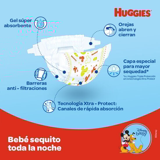 ¡Nuevo y Mejorado! Pañal Huggies® Protect Plus ahora con Cintas Elásticas que acompañan sus movimientos y MÁS Absorción que lo protege 100% hasta 12 horas*. Cuentan con Tecnología Xtra-Protect: canales de rápida absorción y vienen con ¡divertidos diseños de Mickey y sus amigos! *Vs. versión anterior de Huggies Protect Plus. Desempeño del pañal puede variar dependiendo de hábitos, alimentación y características del bebé.