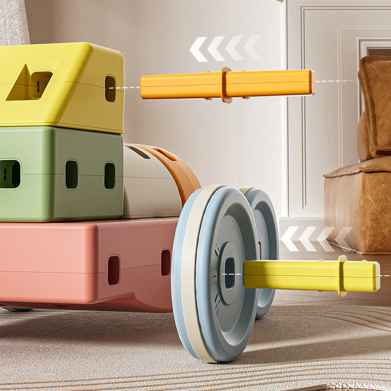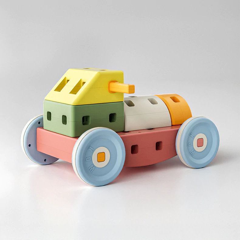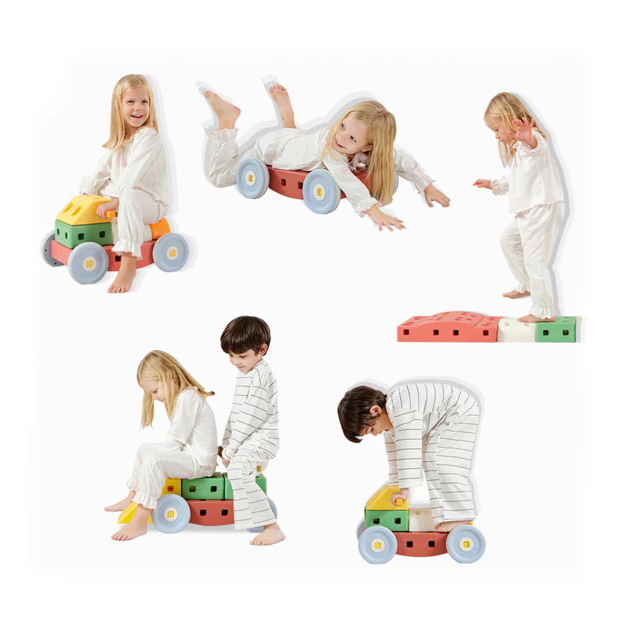 - 36 piezas de bloques, ruedas y conectores con manual para armar facilmente: Pata pata, mecedoras, autitos, torres o lo que se te ocurra.