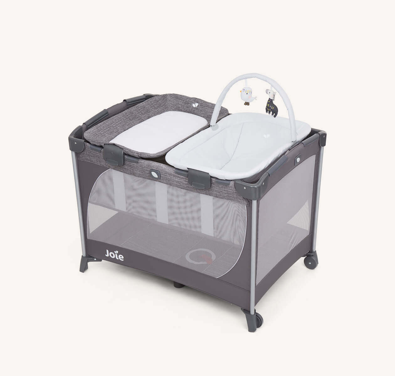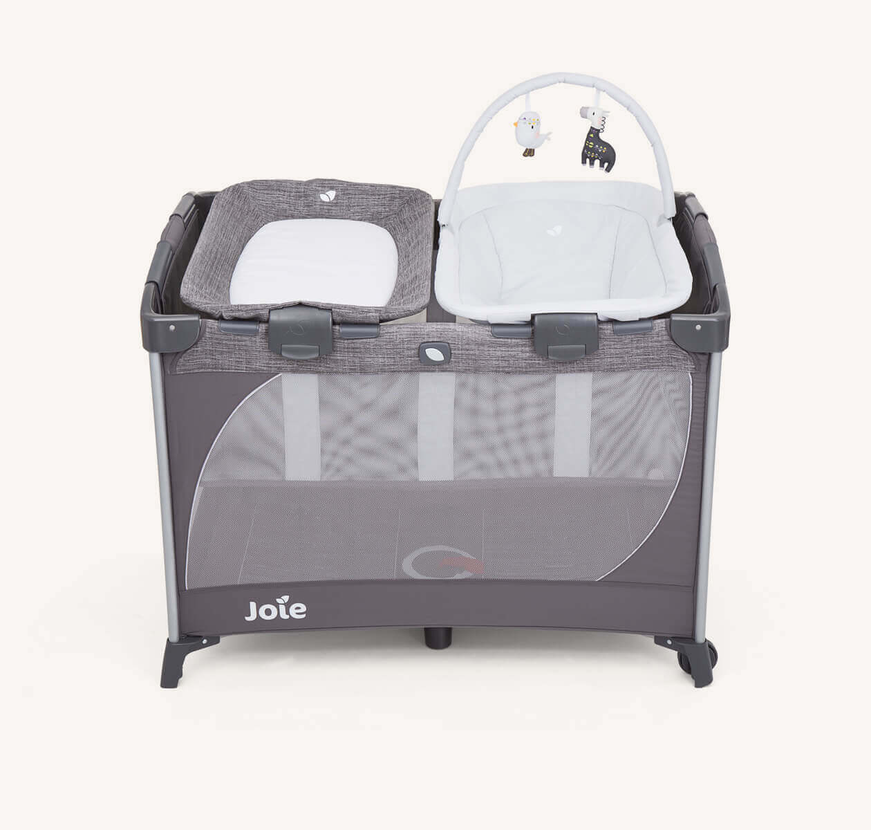 Lista para viajar en un instante con el cambiador y el moisés para dormir incluidos, que se ponen y quitan con un rápido clic, para una mejor accesibilidad mientras realizas tareas de pie, y con un elevador de tamaño completo debajo.