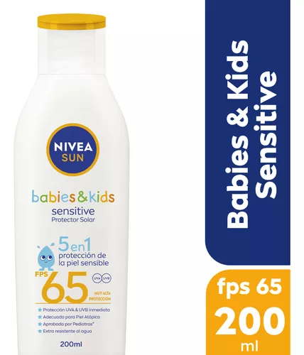 El Protector solar NIVEA SUN Babies & Kids Sensitive 5 en 1 protege de forma inmediata las quemaduras solares. Su fórmula 67% biodegradable con Camomila Orgánica está especialmente desarrollada para la piel sensible de los bebés y niños mayores de 6 meses. Contiene FPS 65 y brinda protección UVA/UVB inmediata. Es adecuado para la piel atópica, está aprobado por pediatras y es extra resistente al agua.
